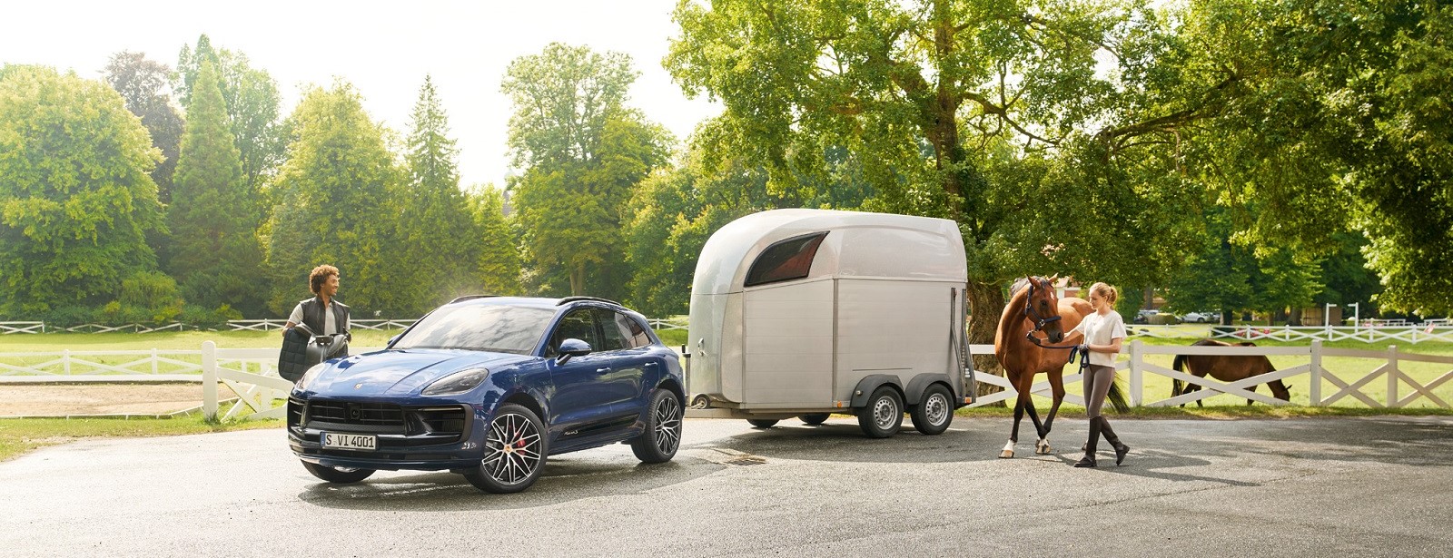 Kugelkopf der Anhängezugvorrichtung kann auf Knopfdruck elektrisch aus- und eingeklappt werden, max. Zuglast 2.000 kg für Macan und 2.400 kg ab Macan S (gebremster Anhänger) bzw. 750 kg (ungebremster Anhänger), max. Stützlast 80 kg für Macan und 96 kg ab Macan S. Mit 13-poliger Steckdose.